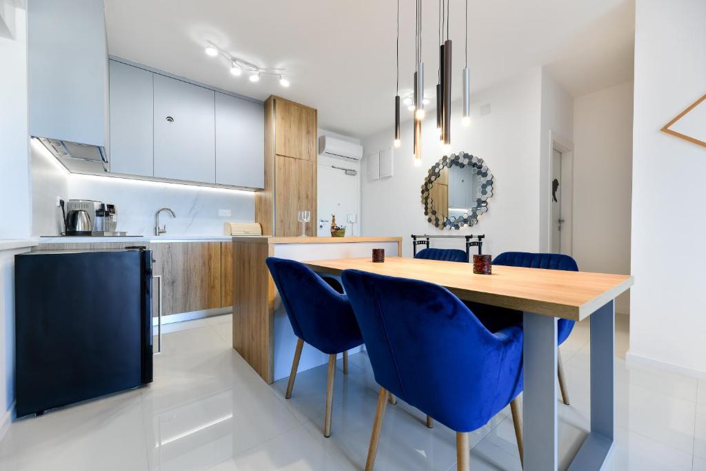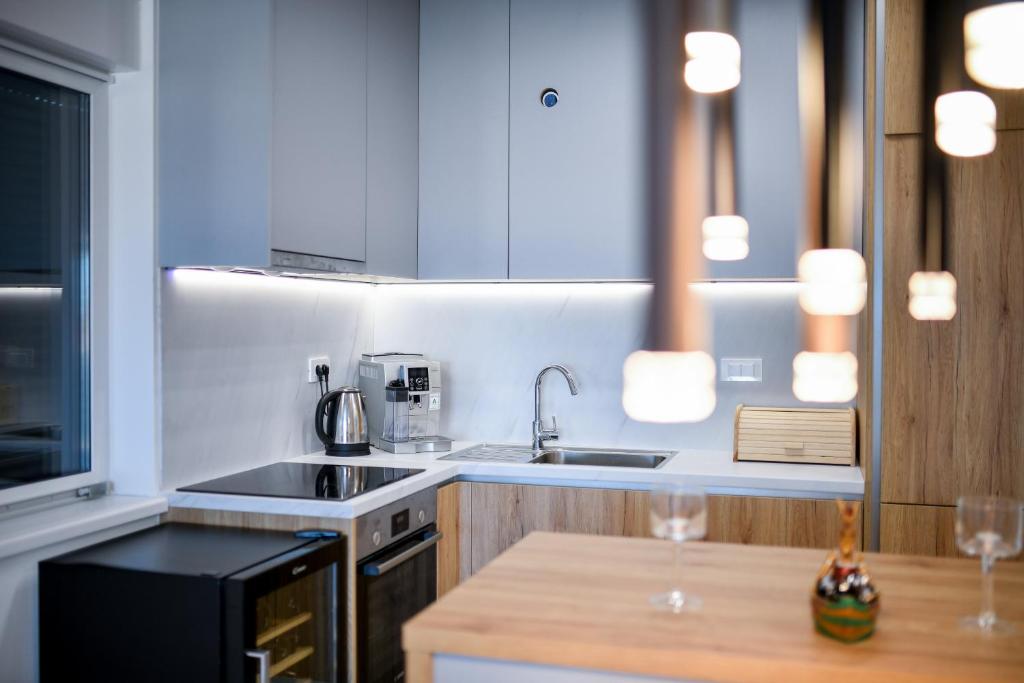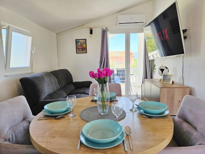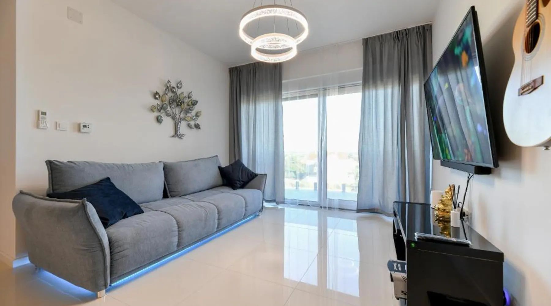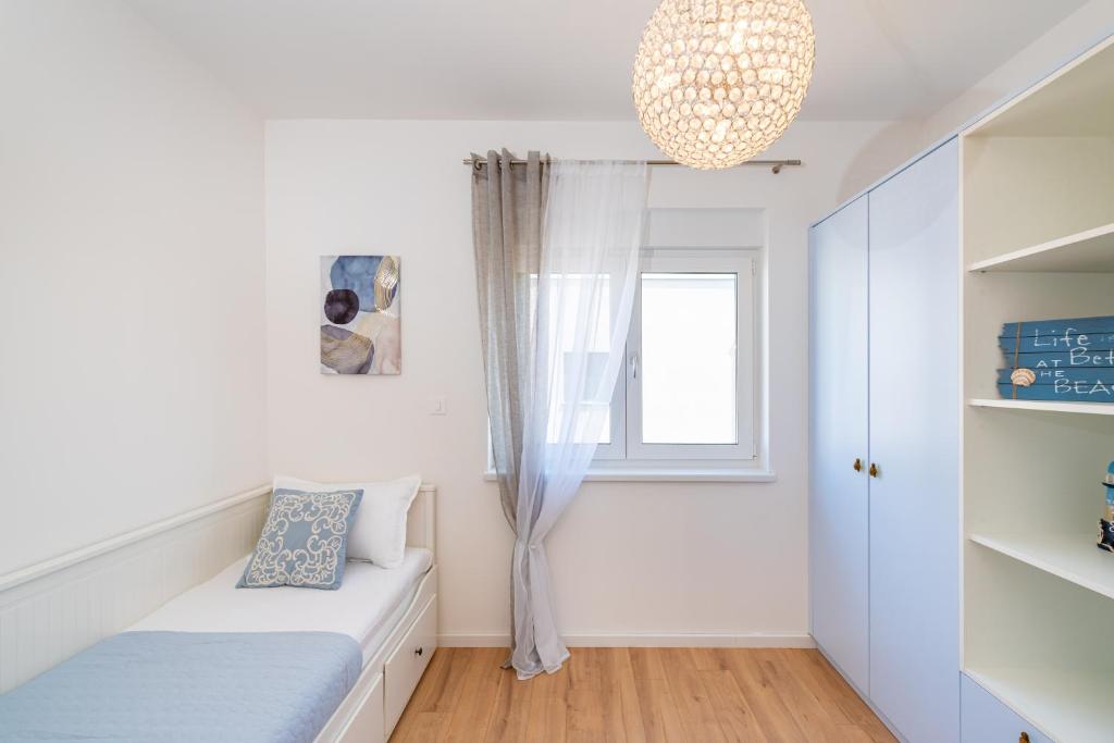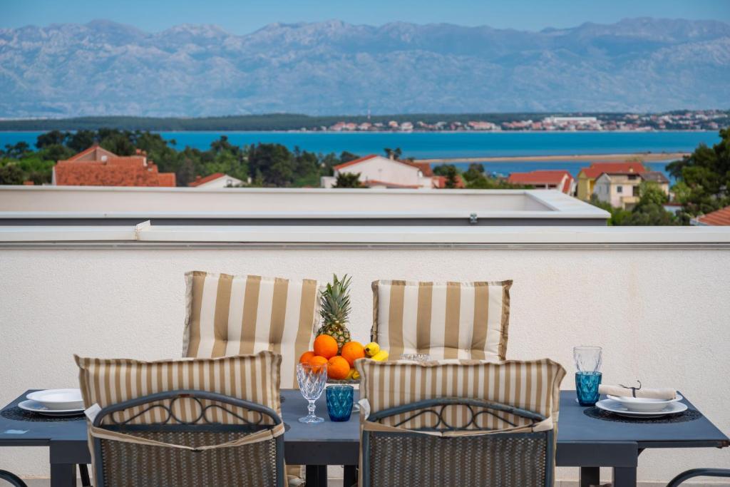 Enjoy breathtaking views where Kraljičina and Ždrijac beaches meet, the entire city, and the Velebit Mountains from this luxurious, modern apartment. It features two bedrooms, a fully equipped kitchen, dining and living area, bathroom, balcony, and a large covered terrace.